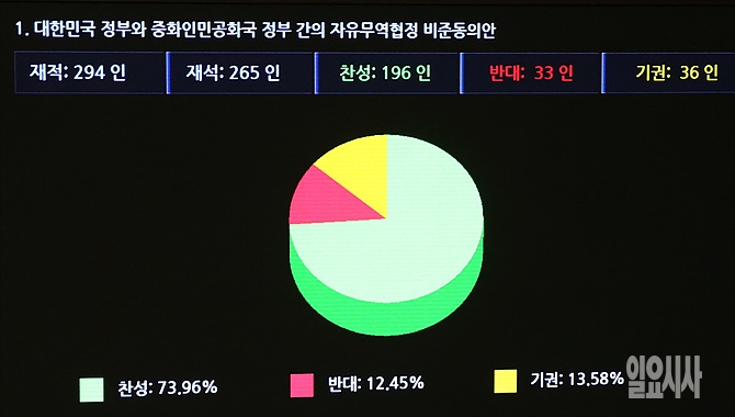 30일, 서울 여의도 국회서 열린 '한중FTA 국회비준안 처리' 표결 결과 재석 265명 중 찬성 196명, 반대 33명, 기권 36명으로 가결되고 있다.