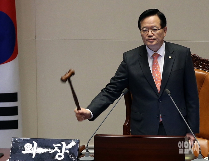 30일, 서울 여의도 국회 본회의장에서 열린 '한중FTA 비준' 본회의 표결 직후 정의화 국회의장이 본회의 통과를 알리는 의사봉을 두드리고 있다.