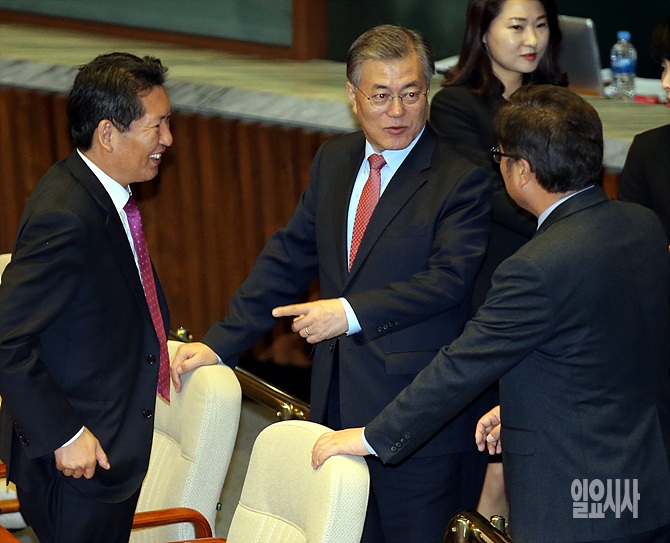 30일, 서울 여의도 국회서 열린 본회의에 앞서 새정치민주연합 문재인 대표(사진 가운데)와 정청래(왼쪽)·이춘석 의원이 대화를 나누고 있다.
