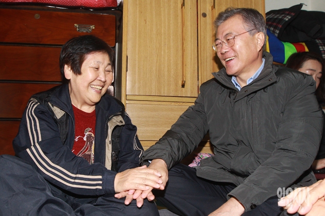 문재인 새정치민주연합 대표가 1일 오전 서울 서대문구에서 가진 독거노인 따뜻한 겨울나기 방문에서 서대문구에 거주중인 독거노인과 대화를 나누고 있다. (사진공동취재단)