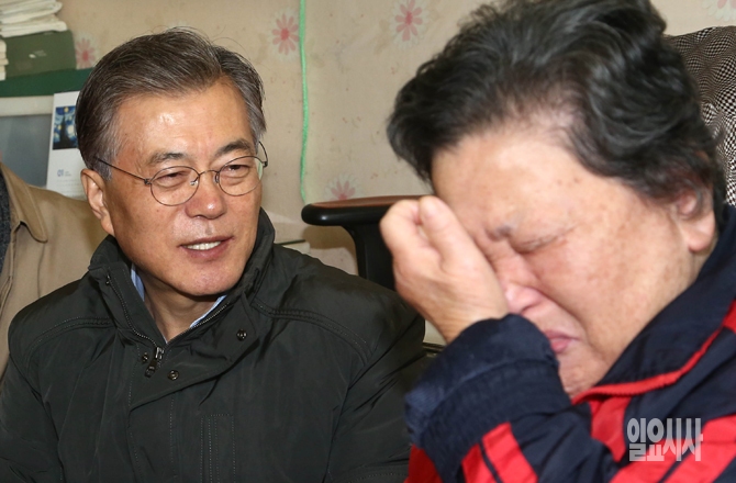 문재인 새정치민주연합 대표가 1일 오전 서울 서대문구에서 가진 독거노인 따뜻한 겨울나기 방문에서 독거노인에게 위로의 말을 전하고 있다. (사진공동취재단)