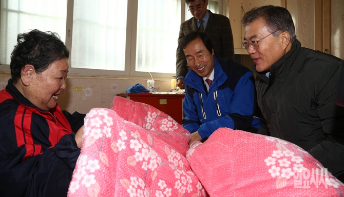 문재인 새정치민주연합 대표가 1일 오전 서울 서대문구에서 가진 독거노인 따뜻한 겨울나기 방문에서 이불을 전달하고 있다. (사진공동취재단)