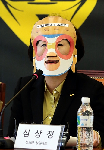 1일, 서울 여의도 국회서 '복면금지법 토론회'가 열린 가운데, 심상정 정의당 대표가 복면금지법을 반대하는 복면을 쓰고 있다.