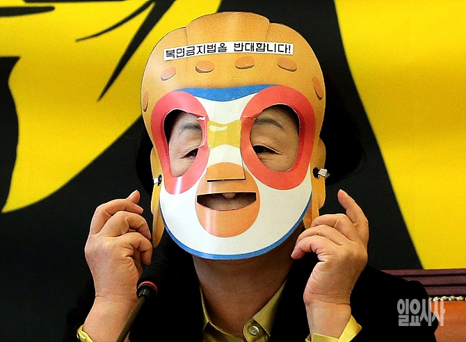 1일, 서울 여의도 국회서 '복면금지법 토론회'가 열린 가운데, 심상정 정의당 대표가 복면금지법을 반대하는 복면을 쓰고 있다.