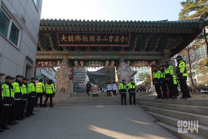 한상균 민주노총 위원장이 조계사에 피신중인 가운데 1일 오후 서울 종로구 견지동 조계사에 한강균 위원장을 검거하기 위해 조계사 주변에 경찰 병력이 배치되어 있다.