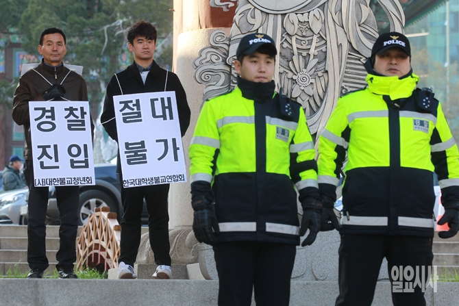 한상균 민주노총 위원장을 검거하기 위해 조계사 주변에 경찰 병력이 배치된 가운데 1일 오후 서울 종로구 견지동 조계사에서 (사)대한불교청년회와 한국대학생불교연합회 회원들이 경찰의 경내 진입을 반대하는 피켓을 들고 있다.