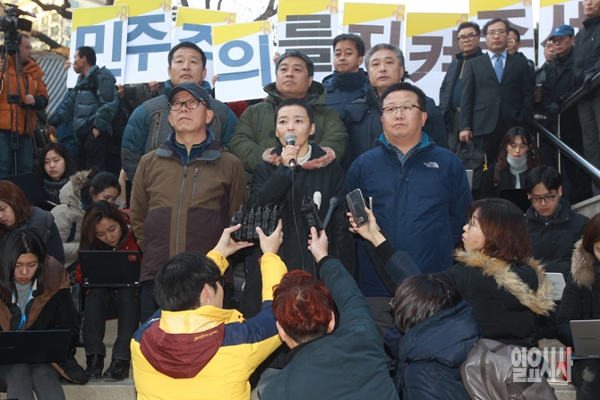 이영주 민주노총 사무총장을 비롯한 민주노총 관계자들이 1일 오후 서울 종로구 견지동 조계사에서 민주노총 입장발표 기자회견을 갖고 있다.