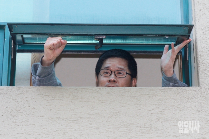 조계사에 피신중인 한상균 민주노총 위원장이 1일 오후 서울 종로구 견지동 조계사에서 민주노총 입장발표 기자회견 도중 모습을 드러내 구호를 외치고 있다.