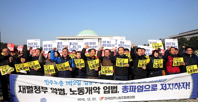 1일, 서울 여의도 국회 앞에서 민주노총 관계자들이 '노동개악 입법'과 관련해 총파업으로 저지하겠다면서 규탄 시위를 벌이고 있다.