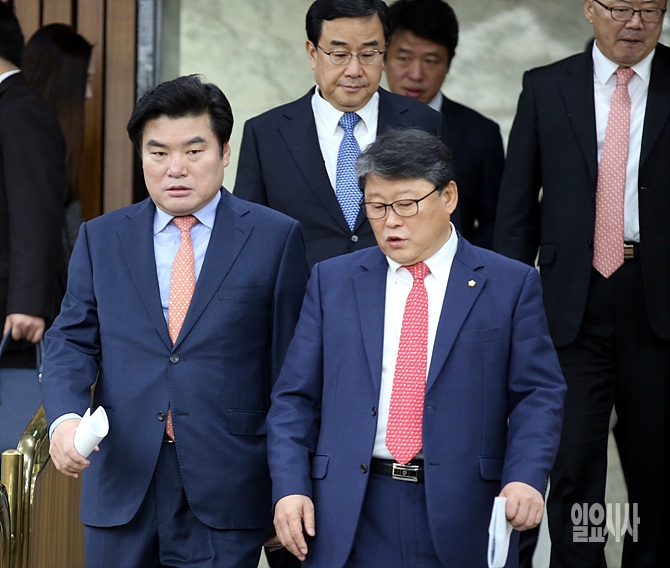 1일, 서울 여의도 국회서 열린 새누리당 원내대책회의를 위해 원유철 원내대표와 김정훈 정책위의장, 조원진 원내수석부대표 등 원내지도부가 회의장 안으로 입장하고 있다.