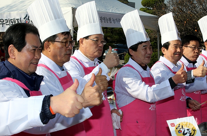 1일, 서울 여의도 국회서 정의화 국회의장(사진 왼쪽서 세 번째)과 새정치민주연합 정세균·김춘진(국회 보건복지위원장, 왼쪽서 두 번째) 의원 등이 생생텃밭과 함께 하는 김장담그기 행사 도중 엄지를 들어보이고 있다.