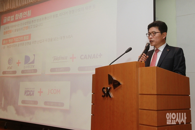 이형희 SK텔레콤 MNO 총괄이 2일 오후 서울 중구 SK텔레콤 본사 사옥에서 열린 CJ헬로비전 인수 및 SK브로드밴드와의 합병 관련 설명회에서 브리핑을 하고 있다.