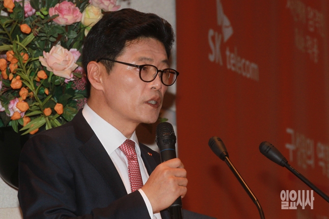 이형희 SK텔레콤 MNO 총괄이 2일 오후 서울 중구 SK텔레콤 본사 사옥에서 열린 CJ헬로비전 인수 및 SK브로드밴드와의 합병 관련 설명회에서 브리핑을 하고 있다.