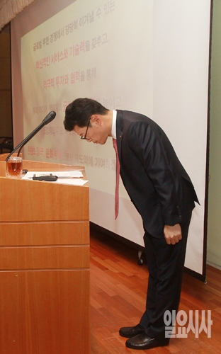 이형희 SK텔레콤 MNO 총괄이 2일 오후 서울 중구 SK텔레콤 본사 사옥에서 열린 CJ헬로비전 인수 및 SK브로드밴드와의 합병 관련 설명회에서 브리핑을 마친 후 인사를 하고 있다.