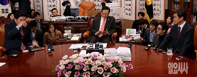 새해예산안 법정처리기한인 2일, 서울 여의도 국회의장실에서 정의화 국회의장과 원유철·이종걸 여야 원내대표가 만나 예산안과 5개 법안 본회의 처리에 대해 논의하기 위해 한 자리에 모여 있다.