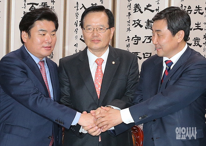 새해예산안 법정처리기한인 2일, 서울 여의도 국회의장실서 정의화 국회의장과 원유철·이종걸 여야 원내대표가 예산안과 5개 법안 본회의 처리에 대한 회동에서 손을 맞잡고 있다.