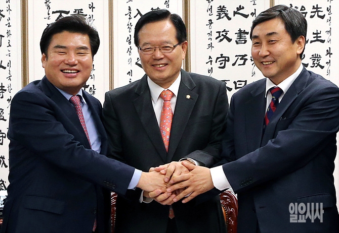 새해예산안 법정처리기한인 2일, 서울 여의도 국회의장실서 정의화 국회의장과 원유철·이종걸 여야 원내대표가 만나 예산안과 5개 법안 본회의 처리 회동에서 손을 맞잡고 웃음 짓고 있다.