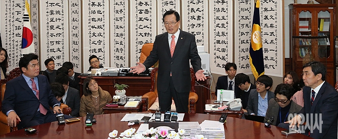 새해예산안 법정처리기한인 2일, 서울 여의도 국회의장실에서 정의화 국회의장(사진 가운데)이 원유철·이종걸 여야 원내대표와 만나 예산안과 5개 법안 본회의 처리에 대해 중재를 하고 있다.