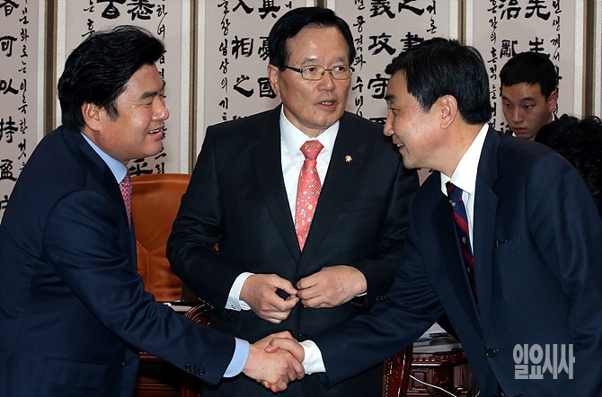2일, 서울 여의도 국회의장실에서 원유철·이종걸 여야 원내대표가 정의화 국회의장 등과 만나 5대법안 본회의 처리 등을 논의하기 위해 모인 가운데, 악수를 나누고 있다.