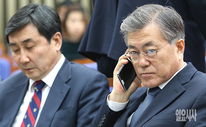2일, 서울 여의도 국회서 새정치민주연합 긴급 의원총회가 열린 가운데 문재인 대표가 심각한 표정으로 전화통화를 하고 있다.