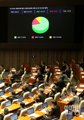 3일, 자정을 넘겨 서울 여의도 국회 본회의장에서 내년도 새해예산안이 법정처리기한인 2일을 넘어 본회의를 통과하고 있다.