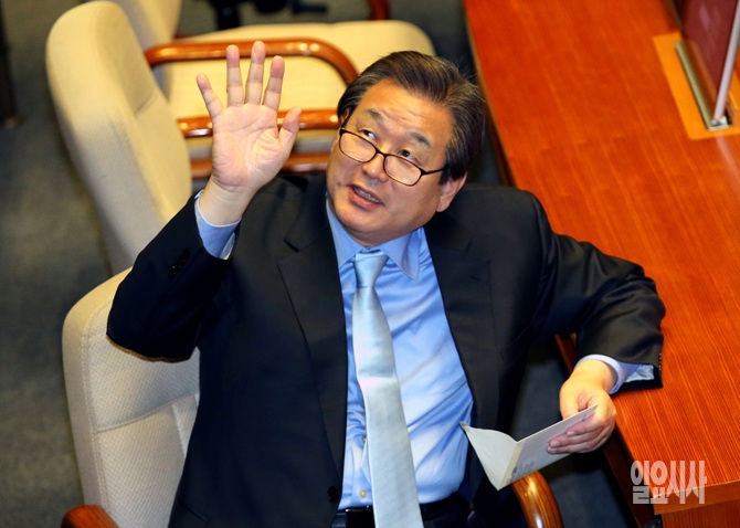 3일, 서울 여의도 국회 본회의장에서 내년도 새해예산안이 법정처리기한인 2일을 넘어 본회의를 통과한 가운데, 새누리당 김무성 대표가 손을 흔들고 있다.