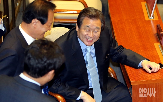 3일, 서울 여의도 국회 본회의장에서 내년도 새해예산안이 법정처리기한인 2일을 넘어 본회의를 통과한 가운데, 새누리당 김무성 대표가 웃음 짓고 있다.