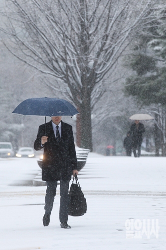 경남 지역을 제외하고 서울 포함 전국 대부분의 지역에 대설주의보가 발효된 가운데 3일 오전 서울 영등포구 여의도에서 출근길에 나선 직장인이 눈길에 발걸음을 서두르고 있다.