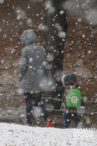 경남 지역을 제외하고 서울 포함 전국 대부분의 지역에 대설주의보가 발효된 가운데 3일 오전 서울 영등포구 여의도에서 한 시민이 아이와 손을 잡고 눈길을 걸어가고 있다.