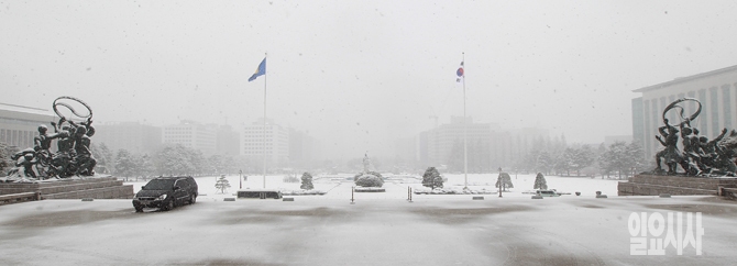 경남 지역을 제외하고 서울 포함 전국 대부분의 지역에 대설주의보가 발효된 가운데 3일 오전 서울 영등포구 여의도 국회의사당에 눈이 내리고 있다.