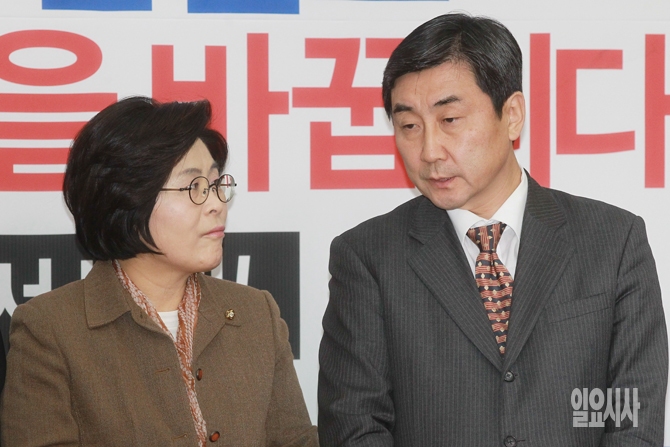 이종걸 새정치민주연합 원내대표가 4일 오전 서울 여의도 국회에서 '남양유업법(대리점거래공정화법)' 처리 상생 꽃달기 행사에서 유승희 최고위원과 대화를 나누고 있다.