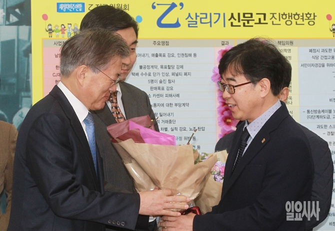 문재인 새정치민주연합 대표가 4일 오전 서울 여의도 국회에서 '남양유업법(대리점거래공정화법)' 처리 상생 꽃달기 행사에서 꽃다발을 전달 받고 있다.