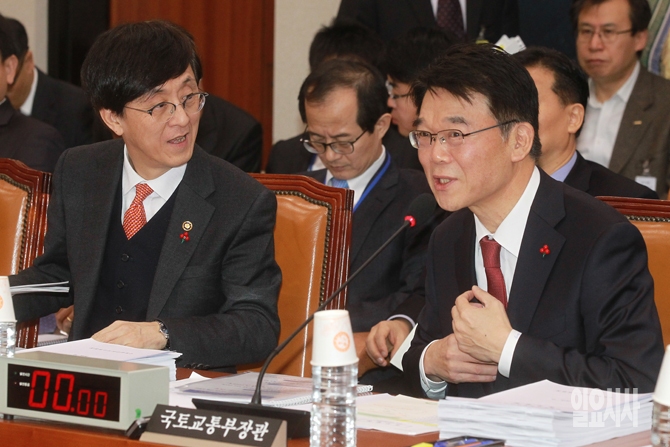 강호인 국토교통부 장관이 4일 오전 서울 여의도 국회에서 열린 국회 국토교통위원회 전체회의에서 김경환 제1차관과 대화를 나누고 있다.