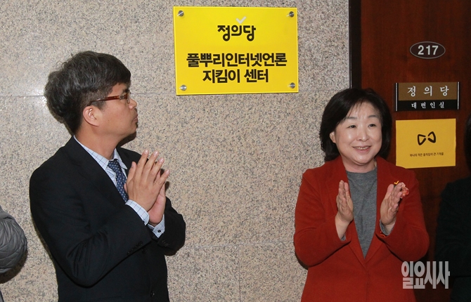 심상정 정의당 상임대표가 4일 오전 서울 여의도 국회에서 풀뿌리인터넷언론 지킴이 센터 현판식 및 인터넷언론인 초청 간담회를 갖고 있다.