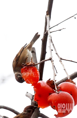 4일 오후 서울 여의도 국회에서 참새가 감나무에 달린 홍시를 먹고 있다.