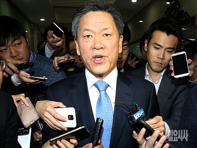 8일, 서울 여의도 국회 정론관 앞에서 새정치민주연합 주승용 최고위원이 최고위원직 사퇴 긴급 기자회견후 취재진의 질문에 답변하고 있다.