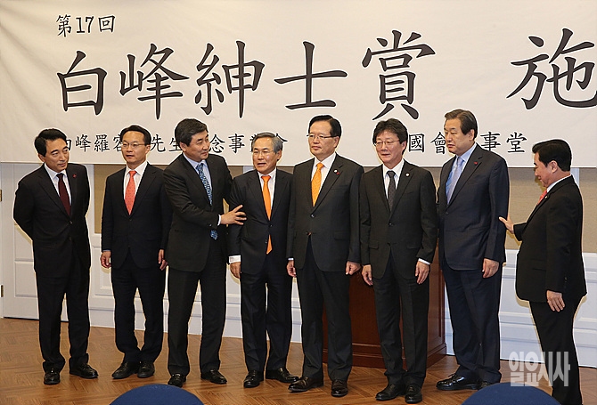 8일, 서울 여의도 국회서 열린 '백봉신사상 시상식'에서 정의화 국회의장, 새누리당 김무성 대표, 새정치민주연합 이종걸 의원, 새누리당 유승민 의원 등이 기념촬영을 하기 위해 준비하고 있다.
