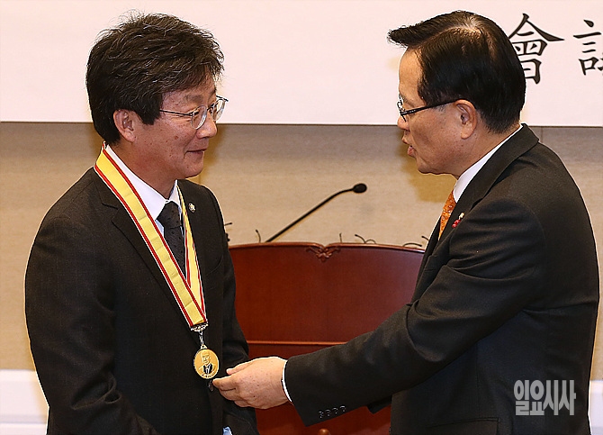 8일, 서울 여의도 국회서 열린 '백봉신사상 시상식'에서 새누리당 유승민 의원이 정의화 국회의장(사진 오른쪽)으로부터 수상과 함께 메달을 수여받고 있다.
