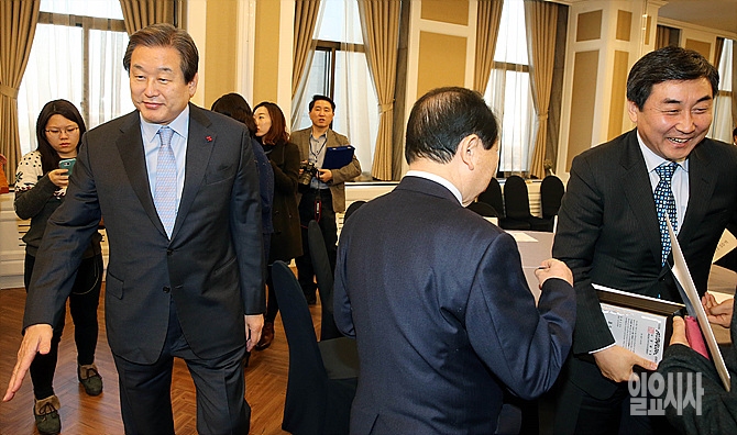 8일, 서울 여의도 국회서 '백봉신사상 시상식' 직후, 새누리당 김무성 대표(사진 왼쪽)과 새정치민주연합 이종걸 원내대표가 시상식 직후 기분 좋은 표정으로 퇴장하고 있다.