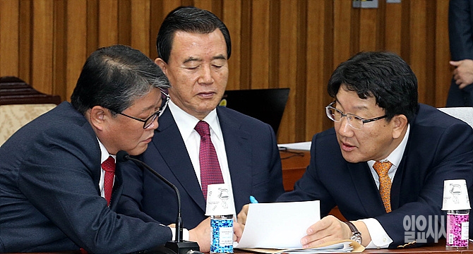 8일, 서울 여의도 국회서 열린 새누리당 원내대책회의서 조원진 원내수석부대표(사진 왼쪽)와 전략기획본부장이 논의를 하고 있다.