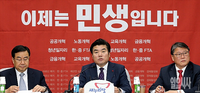 8일, 서울 여의도 국회서 새누리당 원유철 원내대표(사진 가운데), 김정훈 정책위의장(왼쪽), 조원진 원내수석부대표 등이 참석한 가운데, 원내대책회의가 열리고 있다.