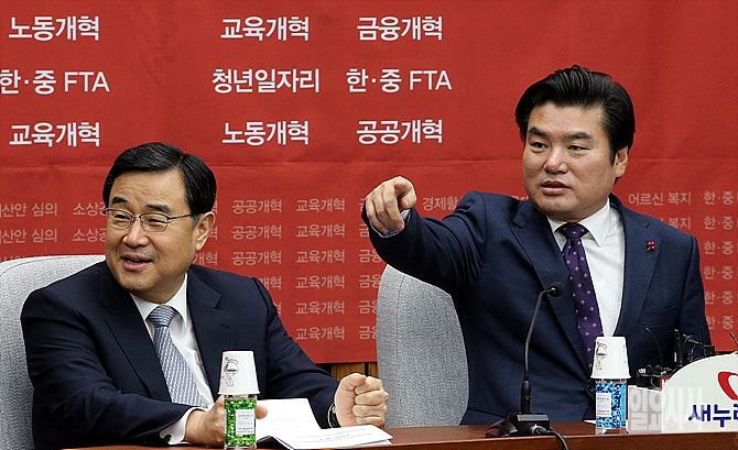 8일, 서울 여의도 국회서 열린 새누리당 원내대책회의서 원유철 원내대표가 잠시 어느 한 곳을 가리키고 있다.