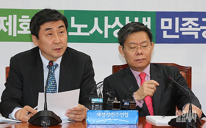 8일, 서울 여의도 국회 새정치민주연합 당대표실에서 열린 원내대책회의서 이종걸 원내대표가 모두발언하고 있다.