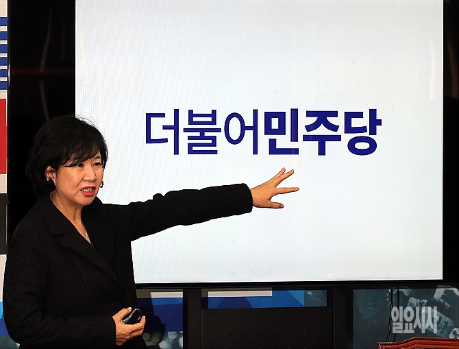 28일, 서울 여의도 국회서 손혜원 새정치민주연합 홍보위원장이 '더불어민주당'으로 당명이 개정됐음을 알리는 기자회견을 갖고 있다.