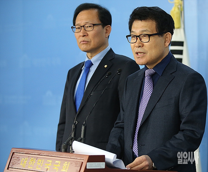 29일, 서울 여의도 국회 정론관에서 더불어민주당 한광원 전 의원(사진 오른쪽)이 이미 탈당한 문병호 의원(왼쪽)과 함께 탈당을 선언하는 기자회견을 갖고 있다.
