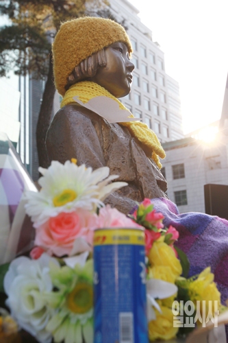 29일 오후 서울 종로구 주한일본대사관 앞에 설치된 일본군 위안부 피해자의 상징인 소녀상 옆으로 꽃과 캔커피가 놓여 있다.