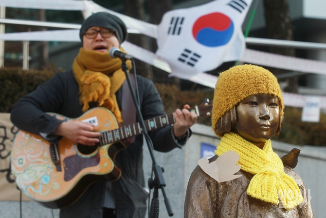 한 시민이 29일 오후 서울 종로구 주한일본대사관 앞에 설치된 일본군 위안부 피해자의 상징인 소녀상에서 소녀상의 이전을 반대하며 공연을 하고 있다.