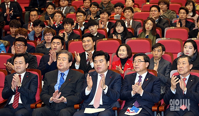 29일, 서울 여의도 국회 의원회관 대강당서 새누리당 김무성 대표(사진 왼쪽서 두 번째), 원유철 원내대표(가운데), 황진하 사무총장(오른쪽), 이기권 고용노동부장관(오른쪽서 두 번째) 등 당직자 및 관계자들이 참석한 가운데 노동개혁 연내 입법을 호소하는 헌혈대회에 참석해 박수를 치고 있다.