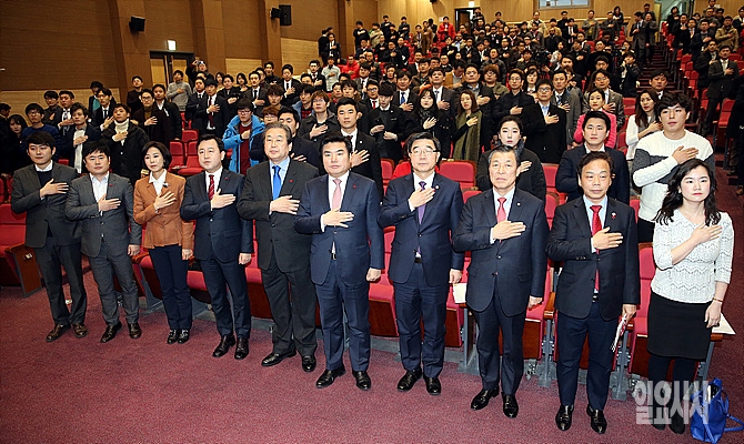 29일, 서울 여의도 국회 의원회관 대강당서 열린 노동개혁 연내 입법을 호소하는 헌혈대회에 앞서 새누리당 김무성 대표(사진 왼쪽서 다섯 번째), 원유철 원내대표(가운데), 이기권 고용노동부장관(사진 오른쪽서 세 번째), 황진하 사무총장(오른쪽서 두 번째) 등 당직자 및 관계자들이 국민의례를 하고 있다.
