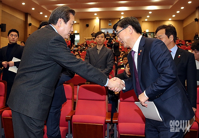29일, 서울 여의도 국회 의원회관 대강당서 열린 노동개혁 연내 입법을 호소하는 헌혈대회에 앞서 새누리당 김무성 대표(사진 왼쪽)가 이기권 고용노동부장관과 악수를 나누고 있다.
